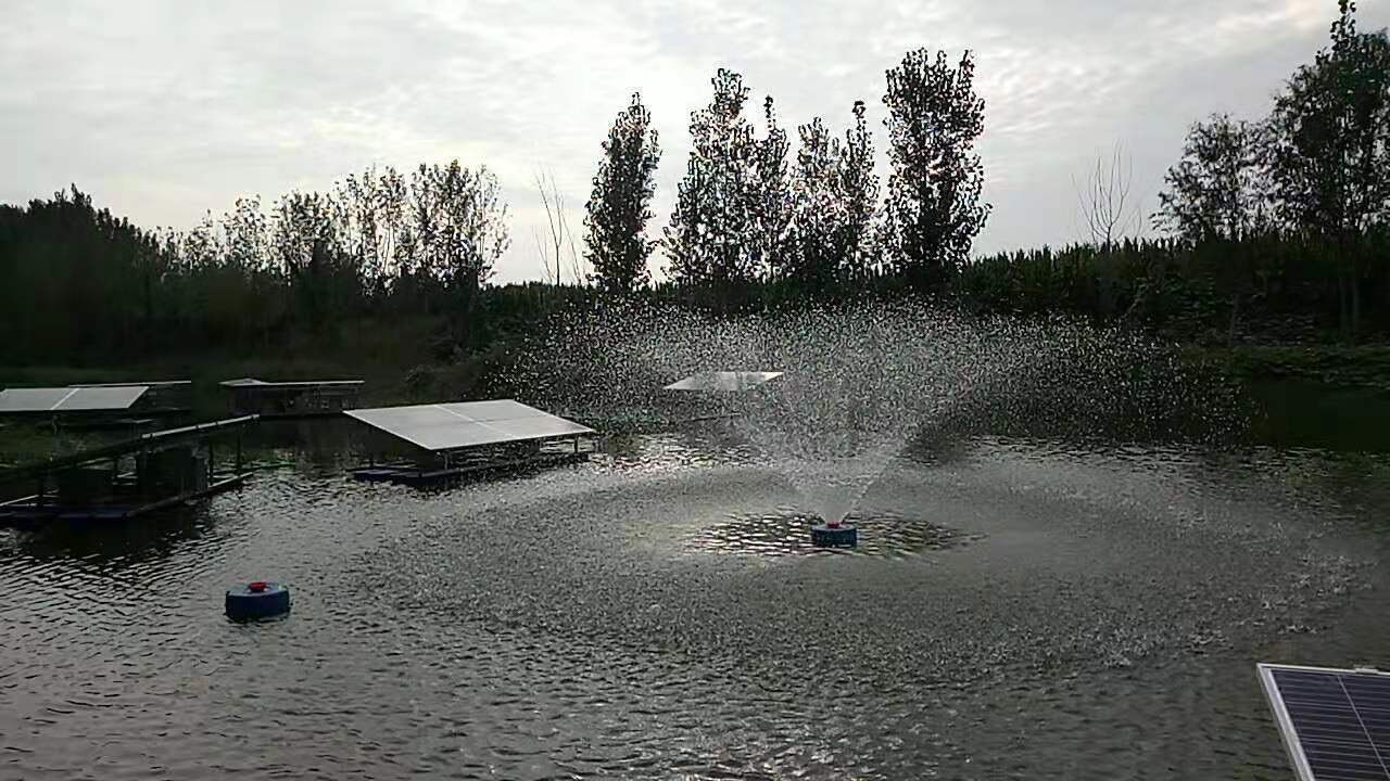 山東菏澤10臺太陽能噴泉曝氣機安裝現場